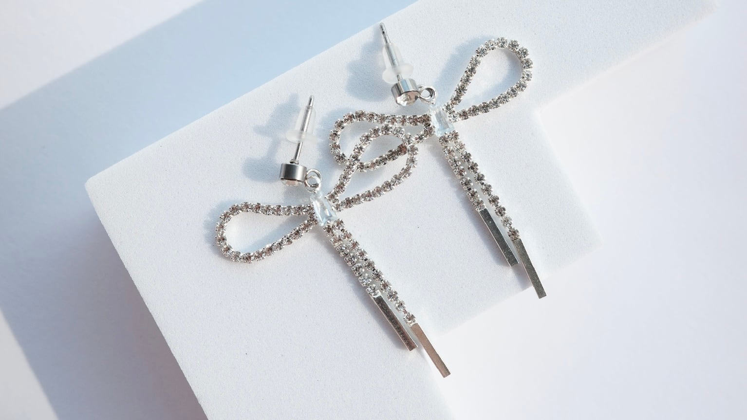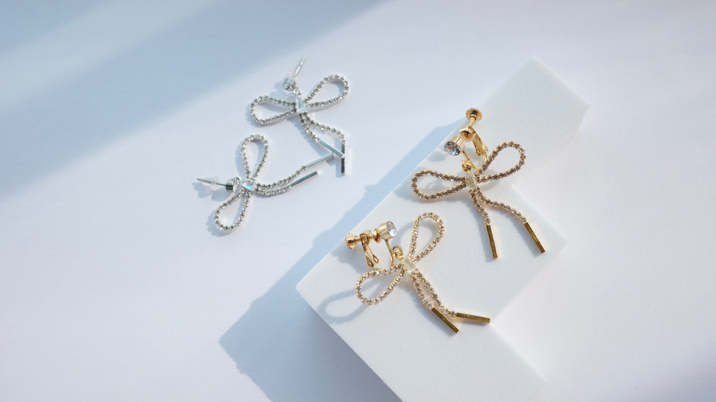 Muse Ribbon Earrings <Gold> or <Silver> 繊細な輝きをまとったリボンモチーフが、耳元を印象的に彩る Muse Ribbon Earrings。 華奢なラインで描いたリボンに、縦にすっと落ちるシルエットを組み合わせることで、甘さの中に大人っぽさを感じるデザインに仕上げました。 動くたびにきらりと揺れ、顔まわりに上品な華やかさをプラス。 可憐なリボンモチーフでありながら、洗練されたバランス感で、きれいめにもフェミニンにも取り入れやすい一品です。 特別な日のおしゃれにはもちろん、シンプルな装いに合わせるだけで、さりげなく心ときめくアクセントに。 自分らしい魅力を引き立ててくれる、THE BELLEらしいロマンティックなピアスです。 ※こちらは2個セット商品です。 ※ピアス、イヤリングをお選びください。 ━━━━━━━━━━━━━━ <使用素材・サイズ> サイズ:約40x34.5x3mm 素材: ラインストーン、真鍮 ※なるべく実物に近い色に写るよう撮影を心がけておりますが、端末や画面設定などにより実物と若干色合いが変わって見える場合がございます。 <注意事項・必ずお読みいただき、ご理解いただける場合のみご購入をお願いいたします。> <配送方法と送料について> 配送範囲:日本国内のみ 配送会社:日本郵便 配送方法:【同一カートにて決済の場合】商品4個まで<ゆうパケット>をご選択ください。 →専用アクセサリー箱に入れ、ゆうパケット用の梱包でまとめて発送いたします。 配送料金:各商品ページからご覧ください。 配送時期:ご注文確定後、原則7営業日以内に発送 ※天候などによる交通状況や、運送上の混雑時期には商品のご到着が遅れる場合がございます。 ・お届け日時の指定:指定はできません。最短にてお届けいたします。 ・発送完了のお知らせ:当日もしくは翌日にメールにてお送りしております。 <その他注意事項に関しまして> 必ずSHOPPING GUIDEをご覧いただき、 同意いただける場合のみご購入をお願いいたします。