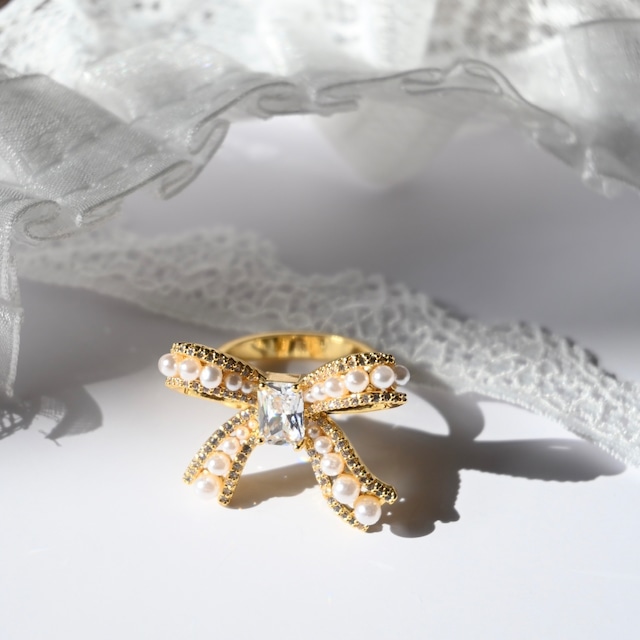 Eternal Ribbon Pearl Ring <Gold> 結びの形に願いを込めた、パールと光のリボンリング。 ひと粒ずつ丁寧に配置されたパールが柔らかな輝きを放ち、 細やかなストーンがその周りを縁取ることで、まるで光のベールをまとったような仕上がりに。 ひとつ着用するだけで映えるので、コーデのポイントになります。 中央のクリアストーンがきらりと光るたび、指先がふわりと可憐に、そして凛と美しく映ります。 特別な日も、いつもの日も。 あなたの手元に“とっておき”のきらめきを添えるリングです。 ━━━━━━━━━━━━━━ <使用素材・サイズ> ●サイズ 内径 約18.1mm ●素材 真鍮、キュービックジルコニア ※微細なキズ、汚れなどが見られる事も稀にありますが、ご理解された上でオーダーをお願いいたします。 <注意事項・必ずお読みいただき、ご理解いただける場合のみご購入をお願いいたします。> <配送方法と送料について> 配送範囲:日本国内のみ 配送会社:日本郵政、ゆうパケット 配送方法:【同一カートにて決済の場合】商品4個まで<ゆうパケット>をご選択ください →専用アクセサリー箱に一つずつ入れ、オリジナル箱でまとめて発送いたします 商品5個以上<宅配便>をご選択ください →専用アクセサリー箱に一つずつ入れ、 宅配便に最適なサイズの箱でまとめて発送いたします。 配送料金:各商品ページからご覧ください。 配送時期:ご注文確定後、原則7営業日以内に発送 ※天候などによる交通状況や、運送上の混雑時期には商品のご到着が遅れる場合がございます ・お届け日時の指定:指定はできません。最短にてお届けいたします。 ・発送完了のお知らせ:当日もしくは翌日にメールにてお送りしております。 <その他注意事項に関しまして> 必ずSHOPPING GUIDEをご覧いただき、 同意いただける場合のみご購入をお願いいたします。