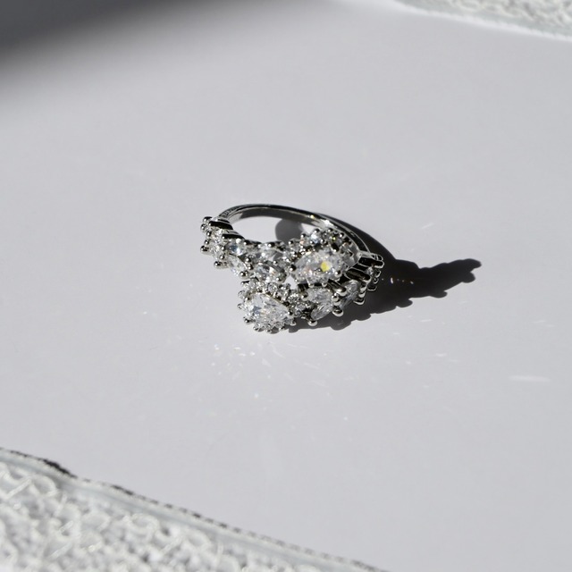 Hug lace ring <Silver> ━“あなたの毎日をそっと抱きしめてくれる”ような余韻をもつリング。 レースのように連なる光が、まるで指先を包み込むように寄り添う“Hug”デザイン。 滴るように輝くティアドロップストーンが、 優しさと気品を宿した手元を叶えます。 重なり合う輝きが、 “あなたの毎日をそっと抱きしめてくれる”ような余韻をもつリングです。 ━━━━━━━━━━━━━━ <使用素材・サイズ> ●サイズ 内径:約17mm ●素材 真鍮、キュービックジルコニア <注意事項・必ずお読みいただき、ご理解いただける場合のみご購入をお願いいたします。> <配送方法と送料について> 配送範囲:日本国内のみ 配送会社:日本郵政、ゆうパケット 配送方法:【同一カートにて決済の場合】商品4個まで<ゆうパケット>をご選択ください →専用アクセサリー箱に一つずつ入れ、オリジナル箱でまとめて発送いたします 商品5個以上<宅配便>をご選択ください →専用アクセサリー箱に一つずつ入れ、 宅配便に最適なサイズの箱でまとめて発送いたします。 配送料金:各商品ページからご覧ください。 配送時期:ご注文確定後、原則7営業日以内に発送 ※天候などによる交通状況や、運送上の混雑時期には商品のご到着が遅れる場合がございます ・お届け日時の指定:指定はできません。最短にてお届けいたします。 ・発送完了のお知らせ:当日もしくは翌日にメールにてお送りしております。 <その他注意事項に関しまして> 必ずSHOPPING GUIDEをご覧いただき、 同意いただける場合のみご購入をお願いいたします。