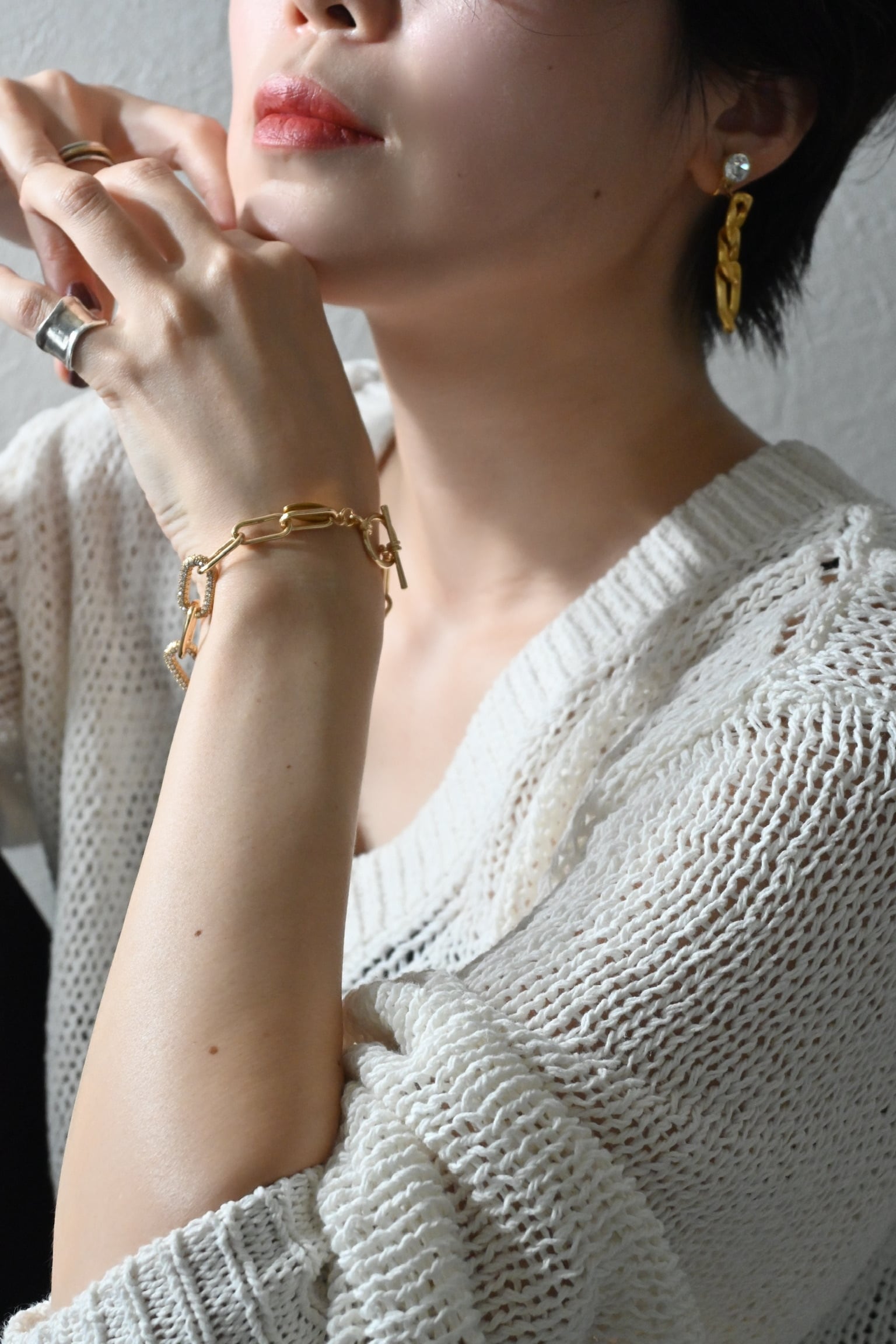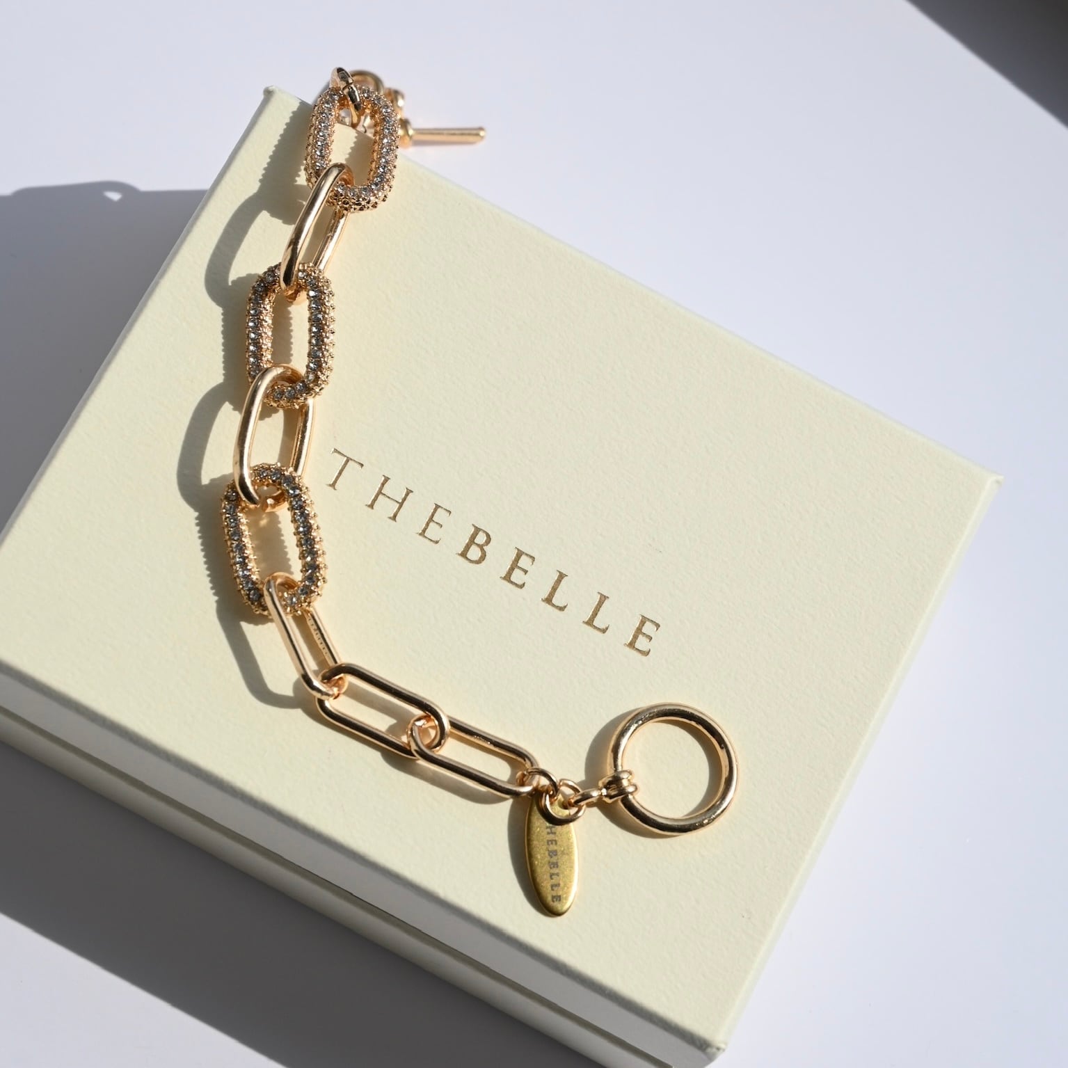 スタイリッシュなチェーンに、ジルコニアが煌めくチェーンを組み合わせた、相反する美しさを織り交ぜたチェーンデザインに、THE BELLEのロゴチャームを添えたシグネチャーブレスレット。