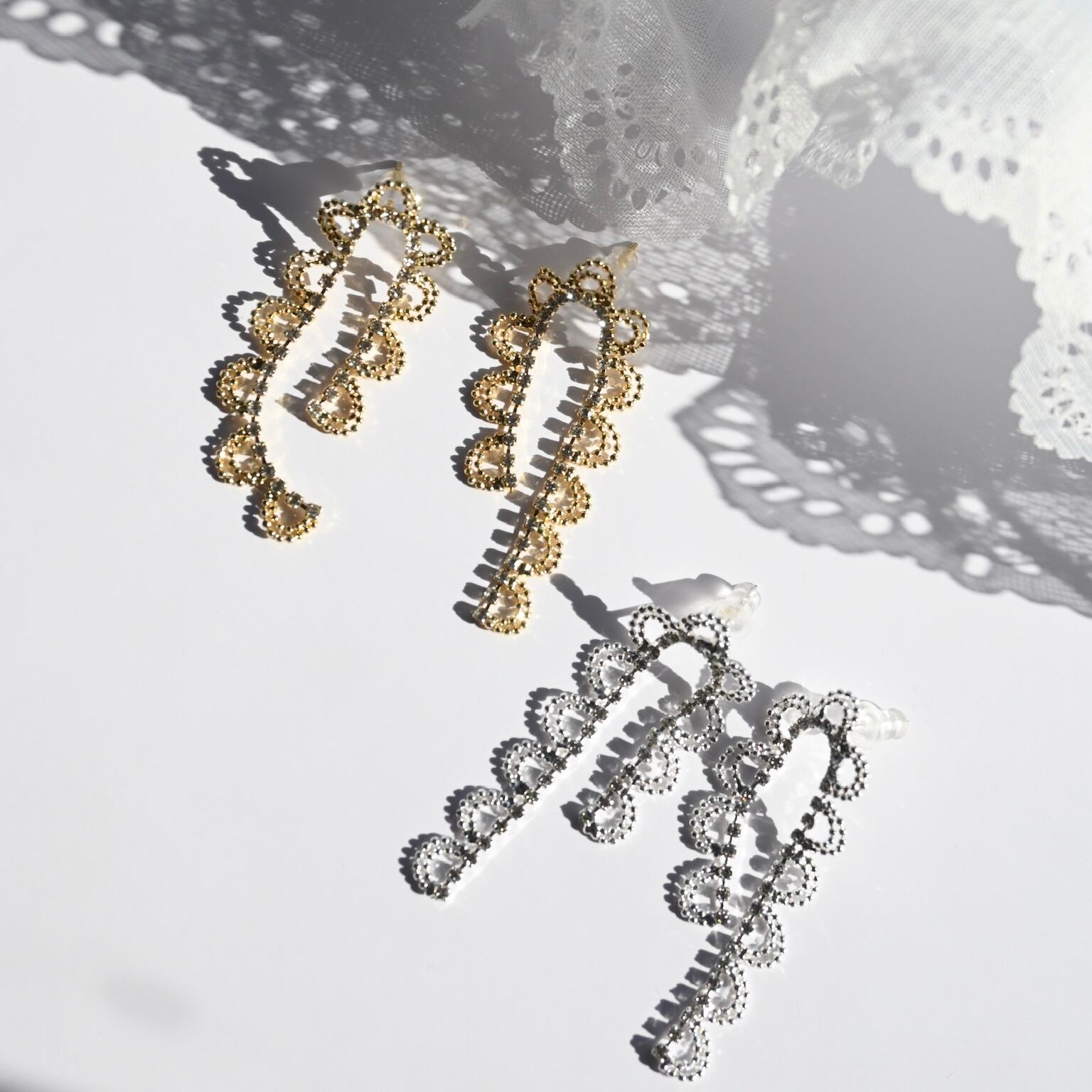 きらめくクリスタルの粒が繊細に連なる、レースモチーフのドロップイヤリング。