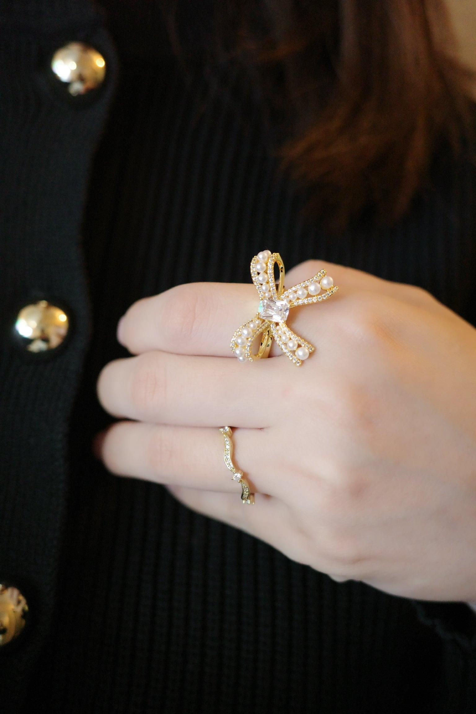 動くたびにストーンが優しくきらめき、指先に“纏うレース”のような余韻を生み出します。