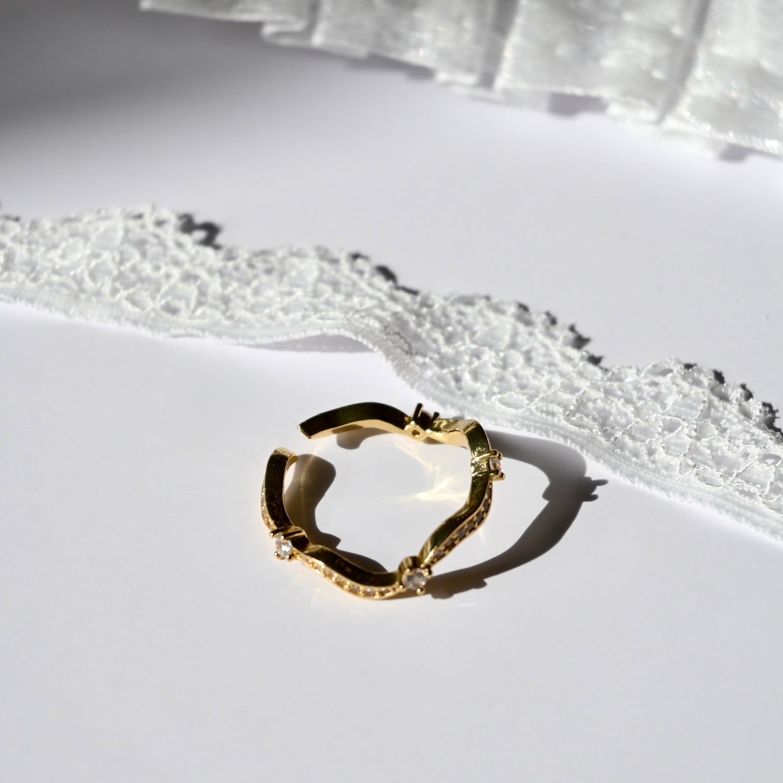 光の粒がレース模様のように連なる、しなやかなカーブラインのリング。