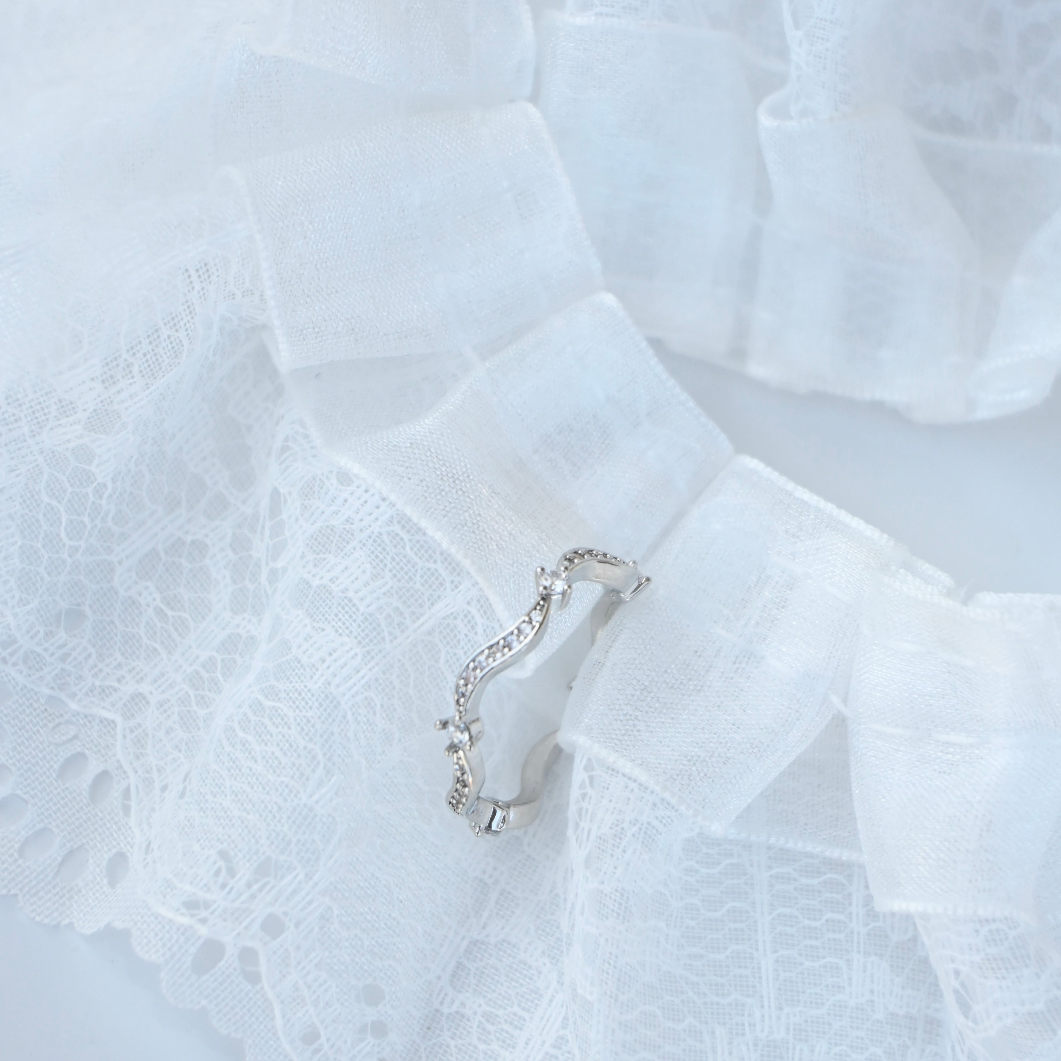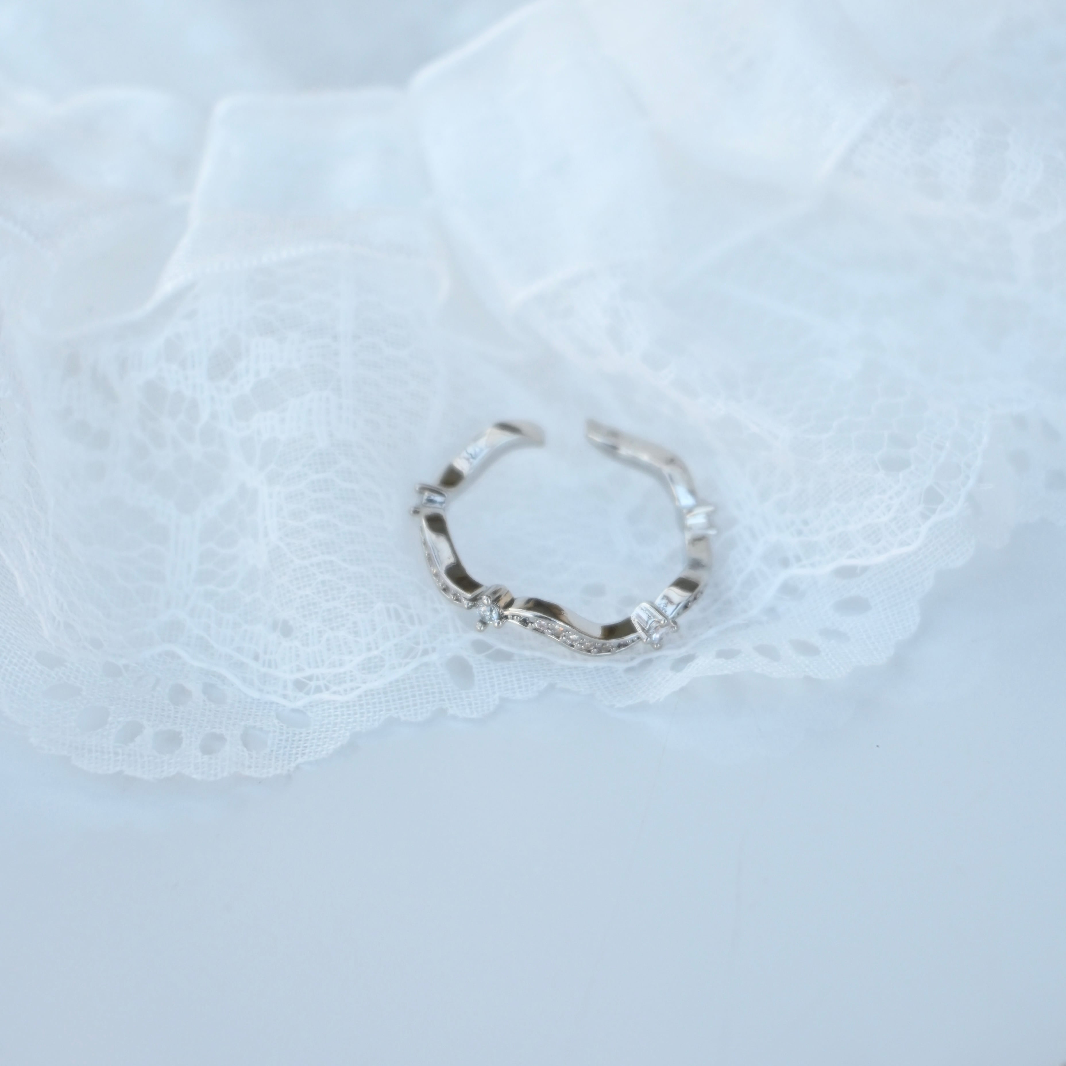 光の粒がレース模様のように連なる、しなやかなカーブラインのリング。