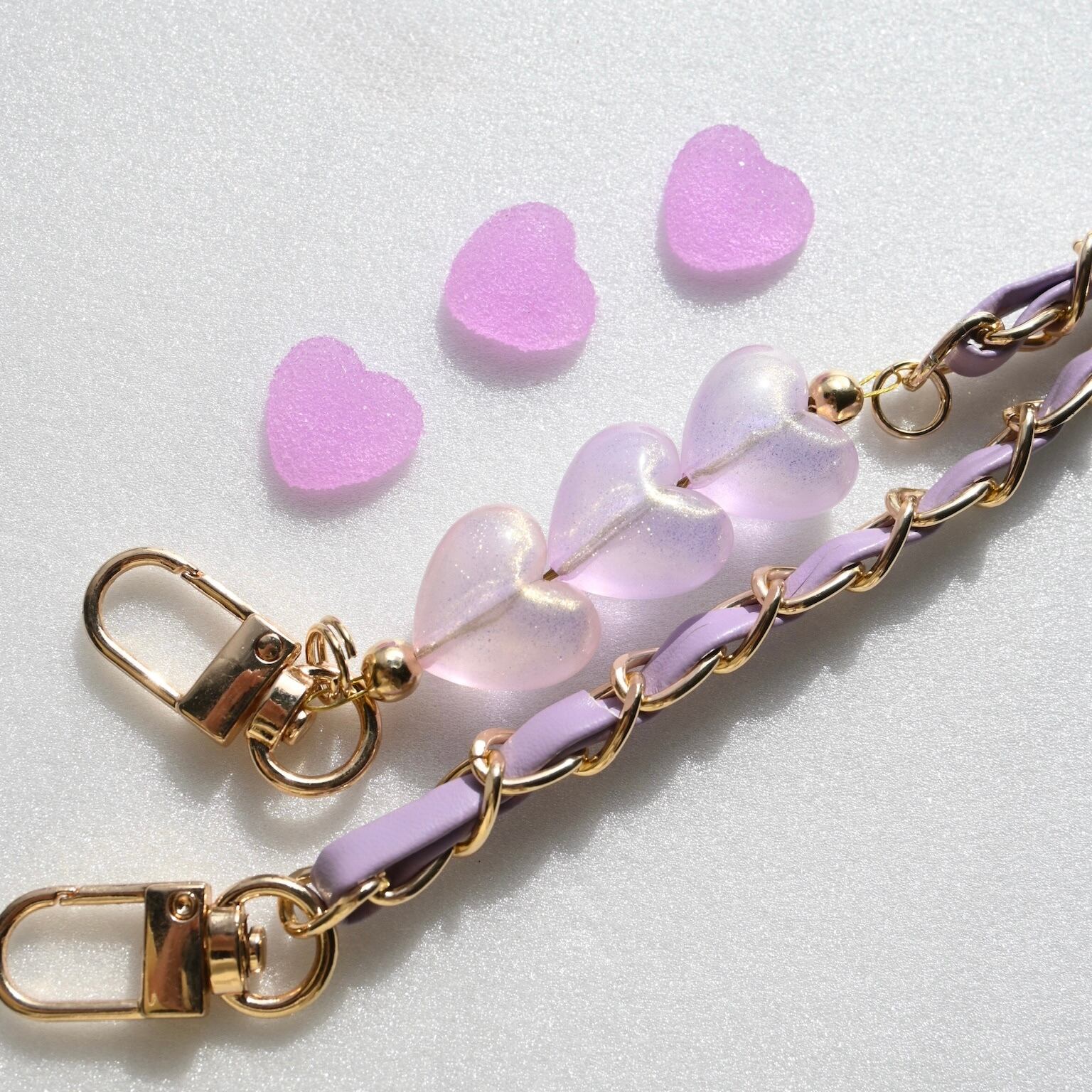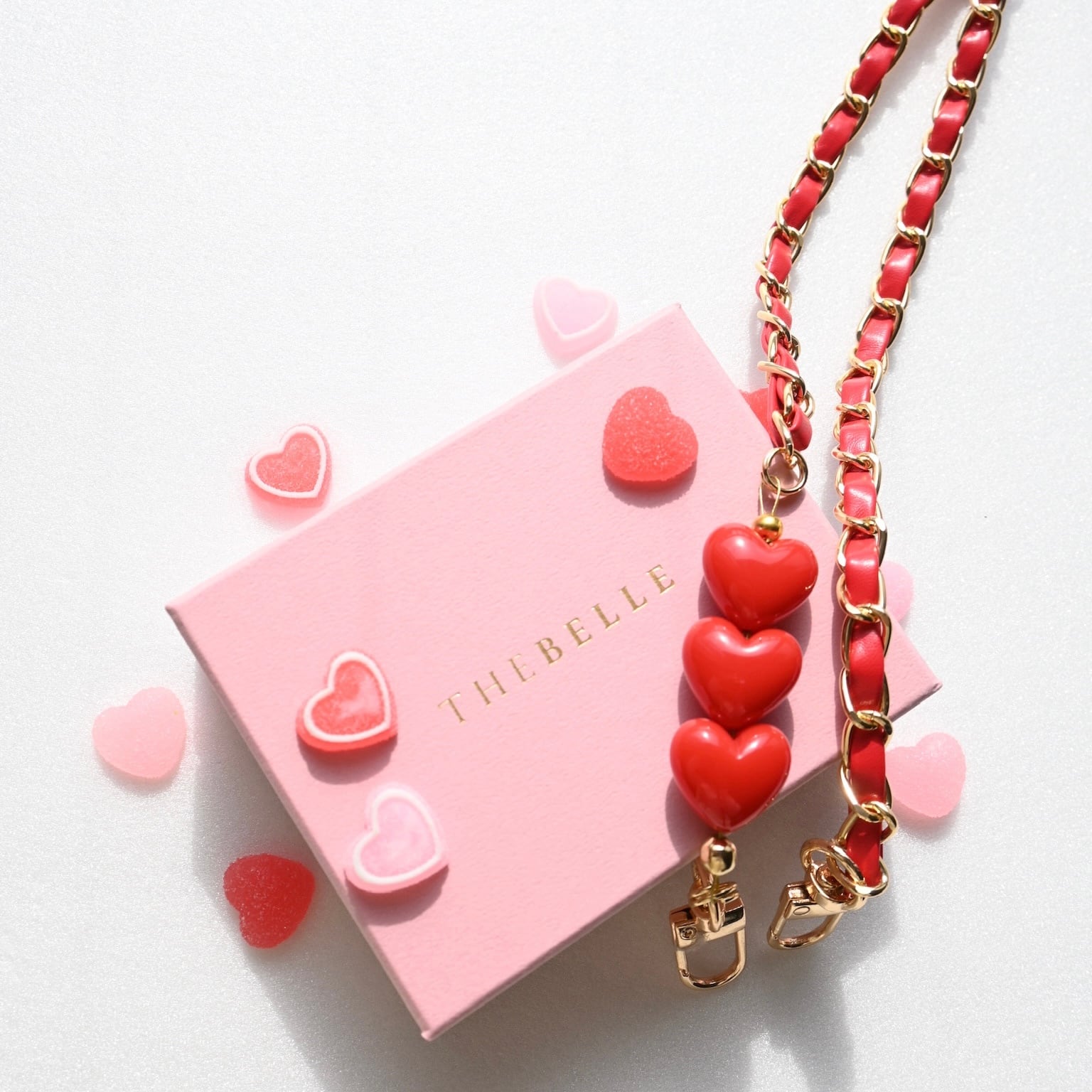 淡いピンクのカラーチェーンにTHE BELLEらしいハートのチャームつけた期間限定のアイテムです。