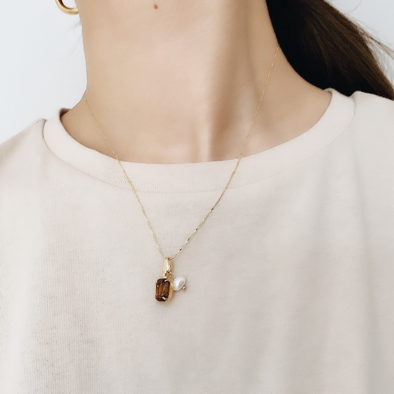 淡水パールのチャームで抜け感が出るため、