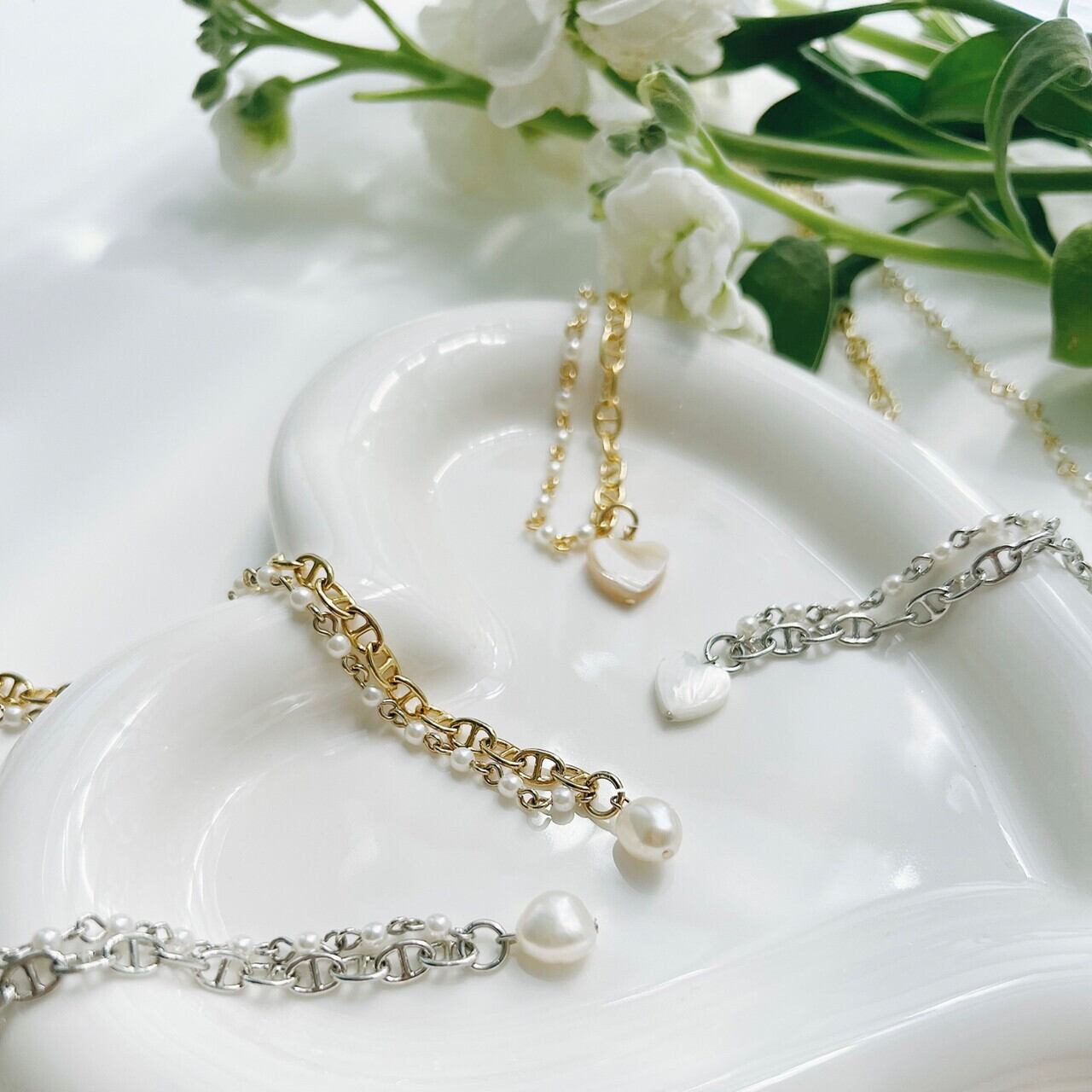 重厚感のあるチェーンと、エレガントで華奢なパールチェーンを組み合わせることによって