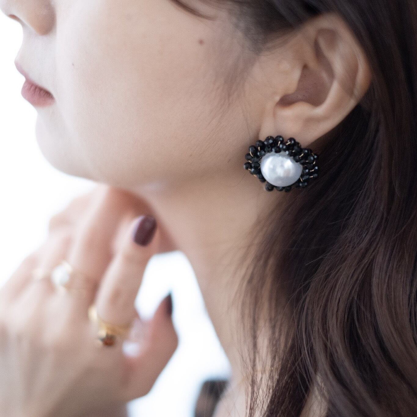 ブラックのイヤリングやピアスは、どうしてもクールになりすぎるので、