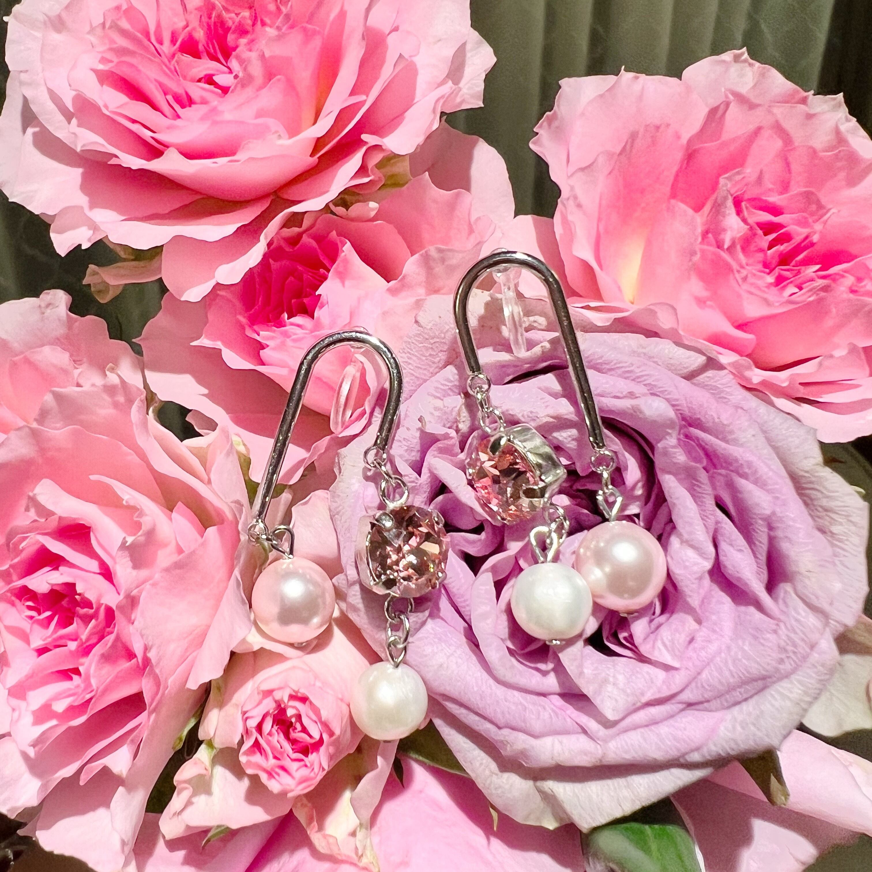 ミルキーピンクのスワロフスキーパール、ホワイトの淡水パールを使用。