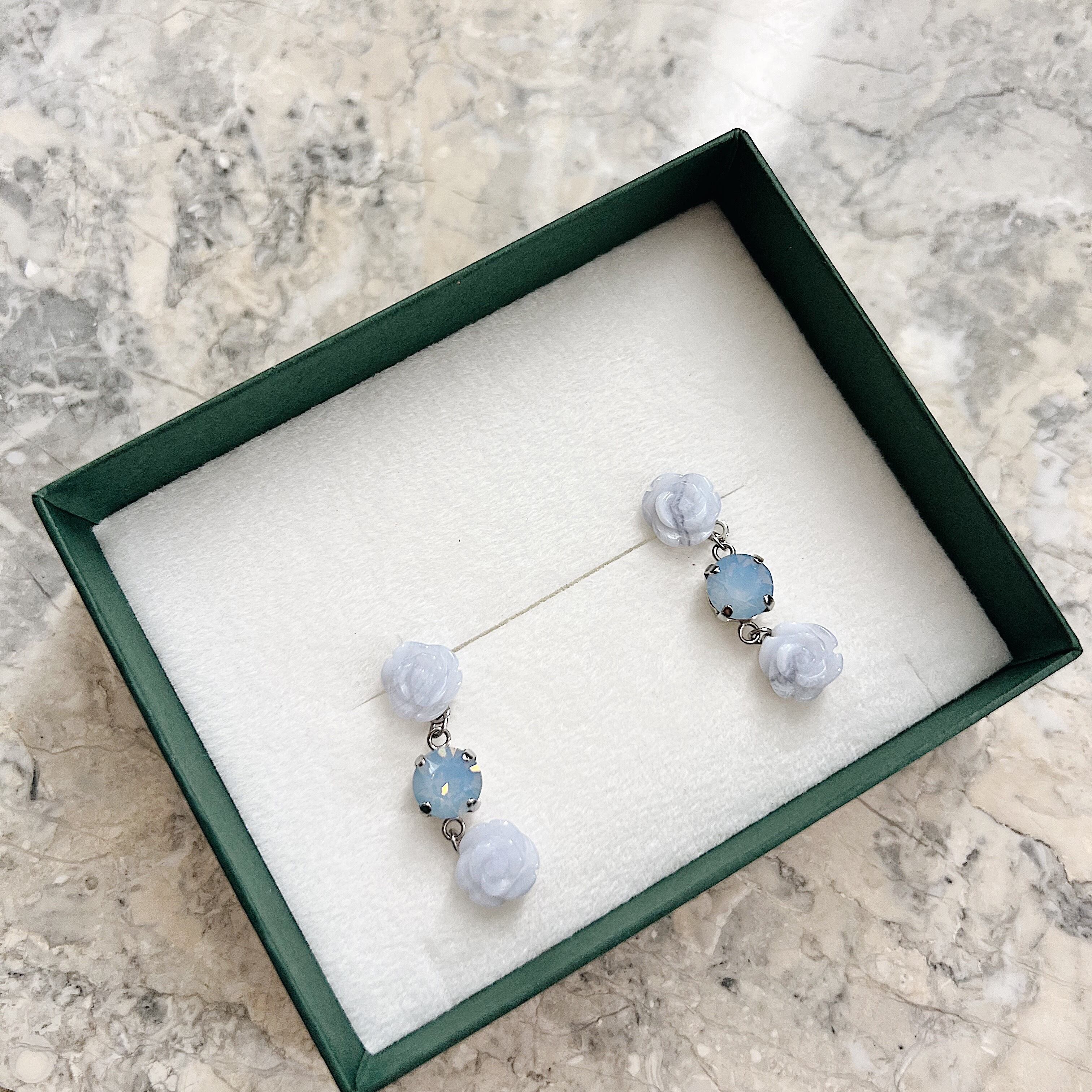 美しいミルキーブルーのカラーは、同系色のカラーのスワロフスキーストーンとあわせることで、