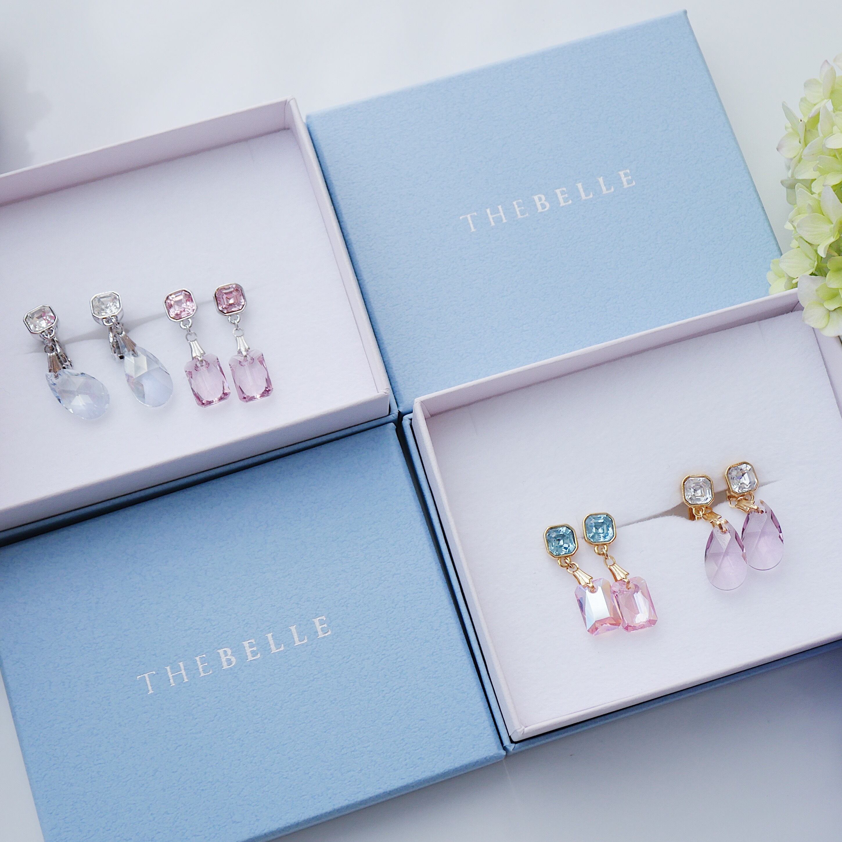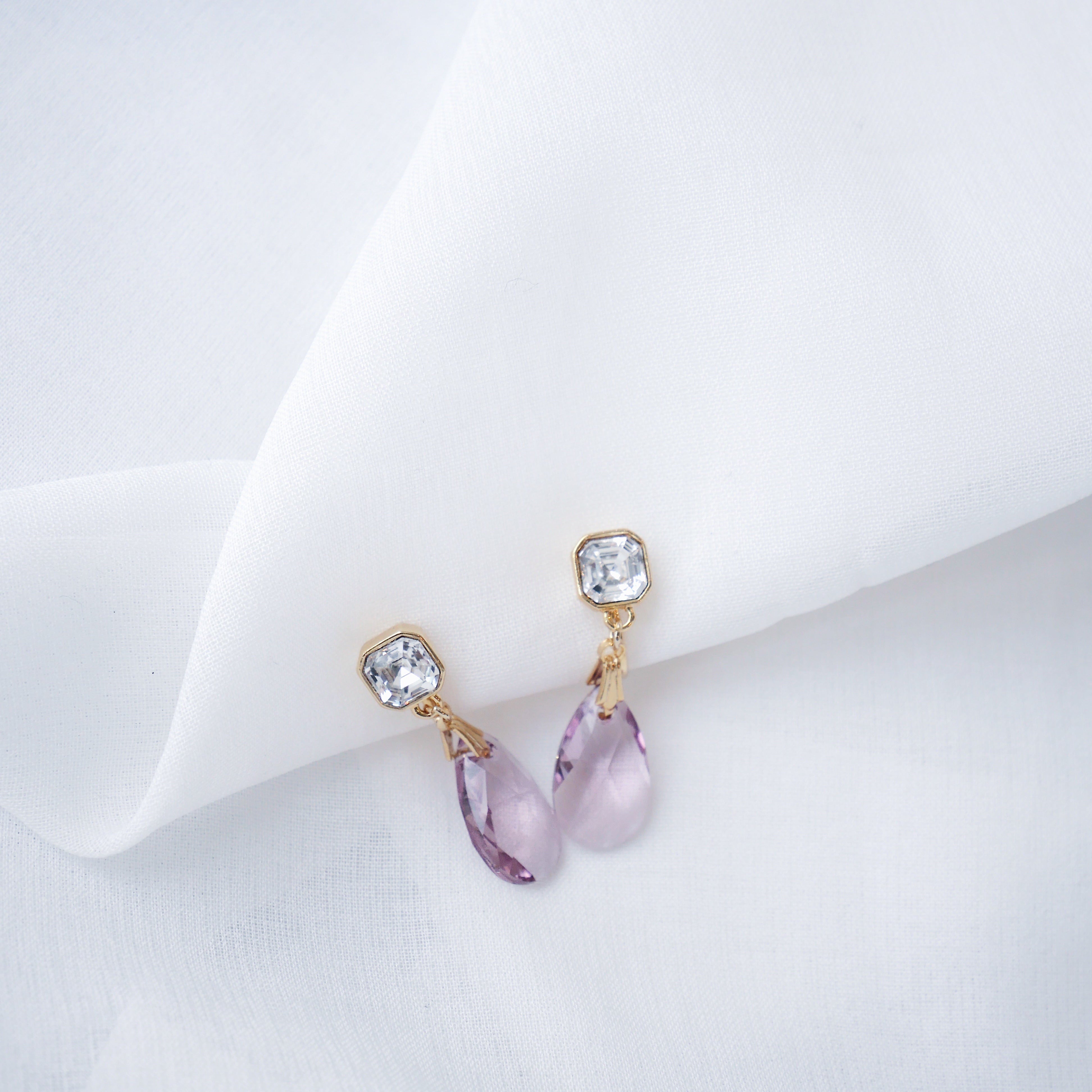 雨に濡れた紫陽花をイメージにした、華やかなスワロフスキークリスタルが輝くイヤリング、ピアスシリーズ。
