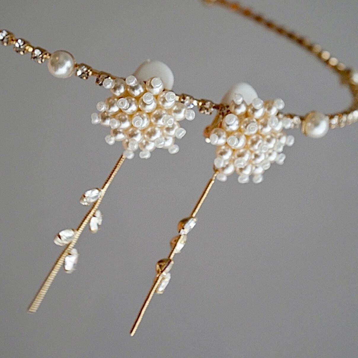 ガラスのお花がきらきら繊細に輝き、葉の部分は揺れ感のある華奢なチェーンで表現しました。