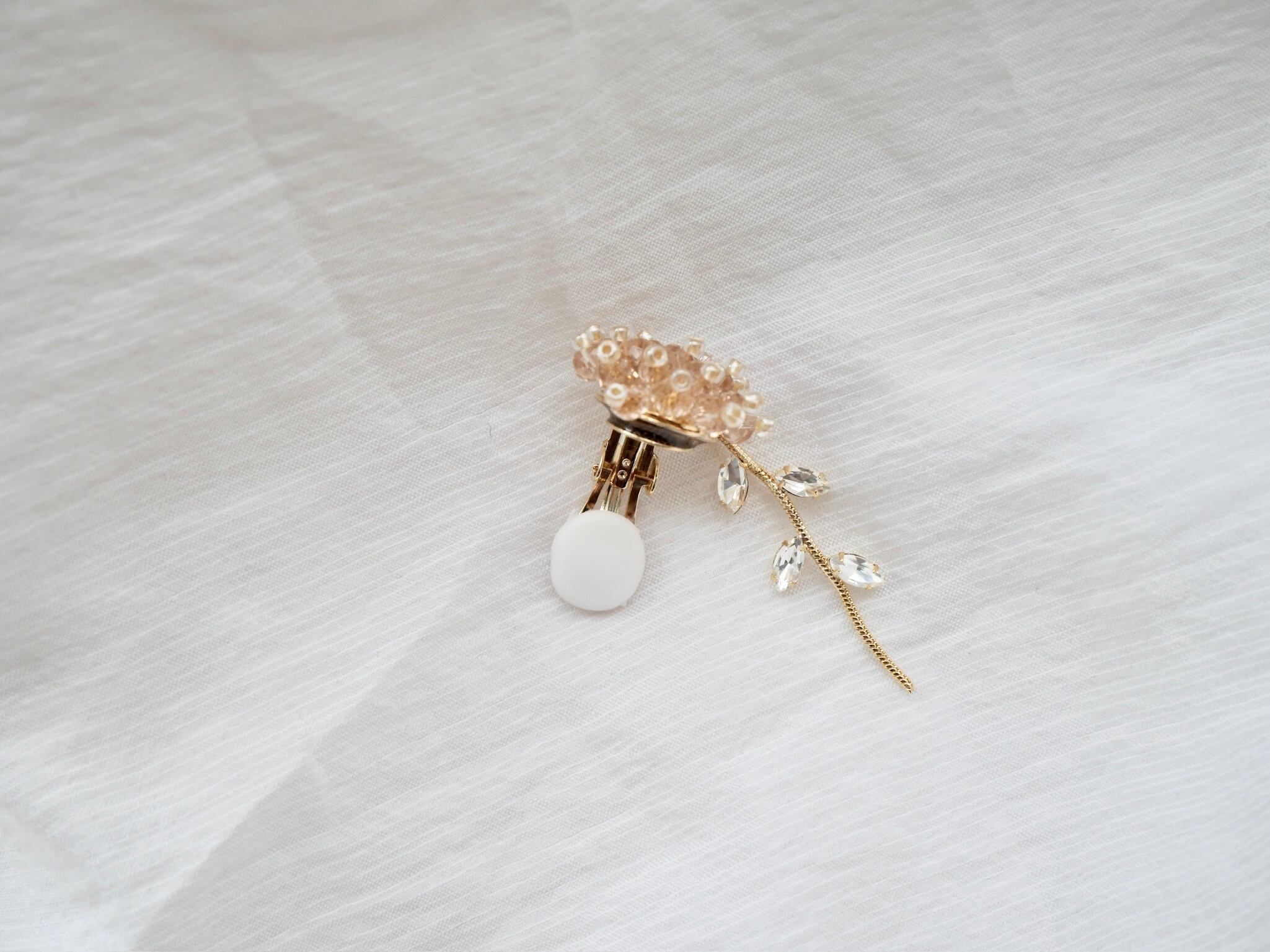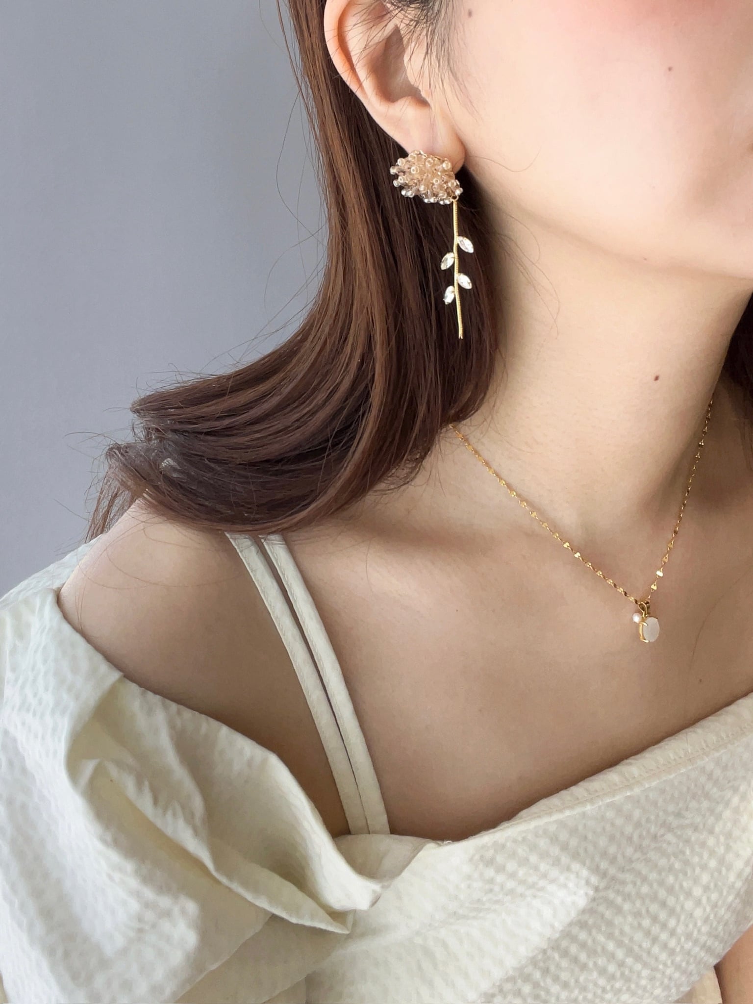 ガラスのお花がきらきら繊細に輝き、葉の部分は揺れ感のある華奢なチェーンで表現しました。