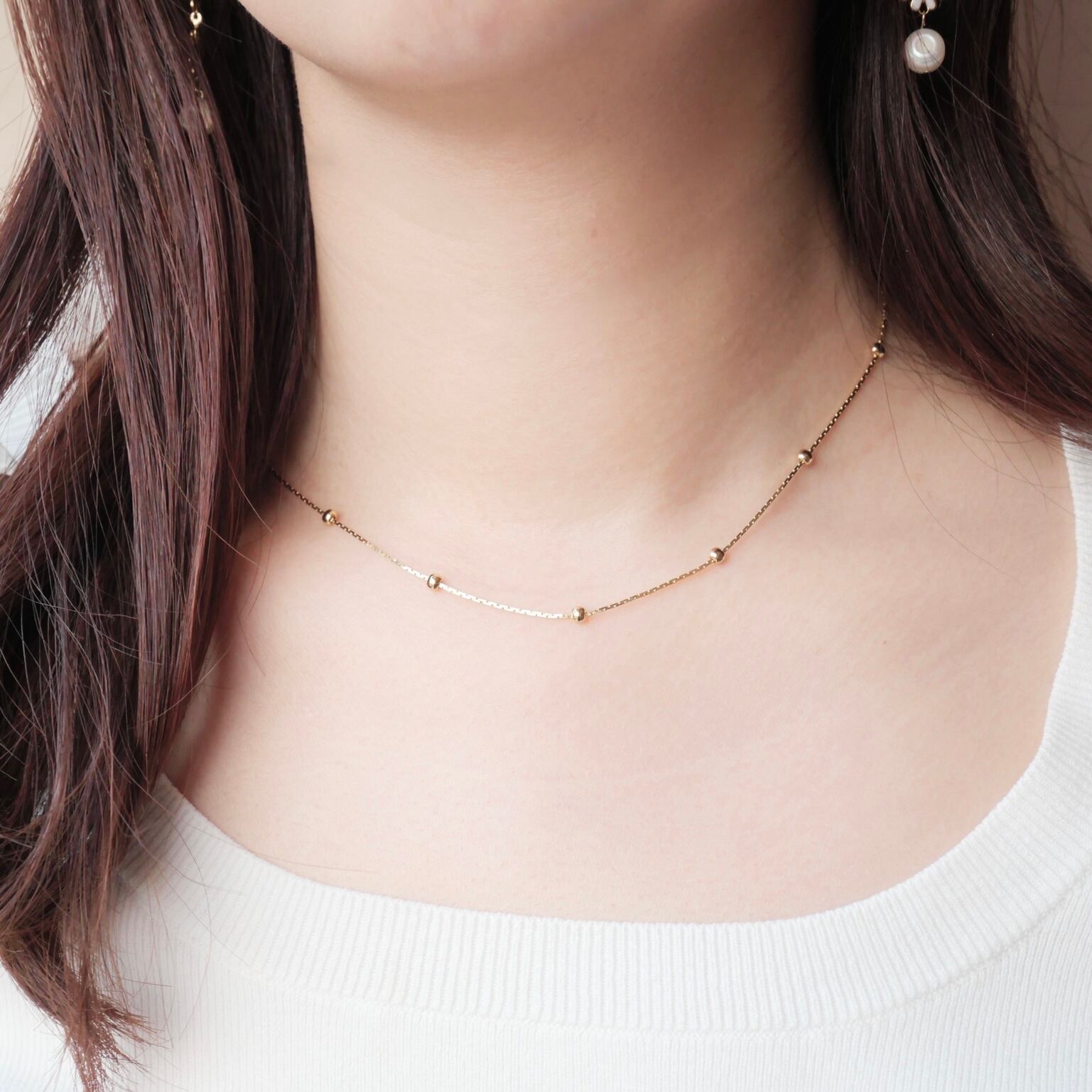耳元にゴージャスなアクセサリーを使用する際はチャームを外してシンプルなチェーンネックレスとして抜け感を演出できます。