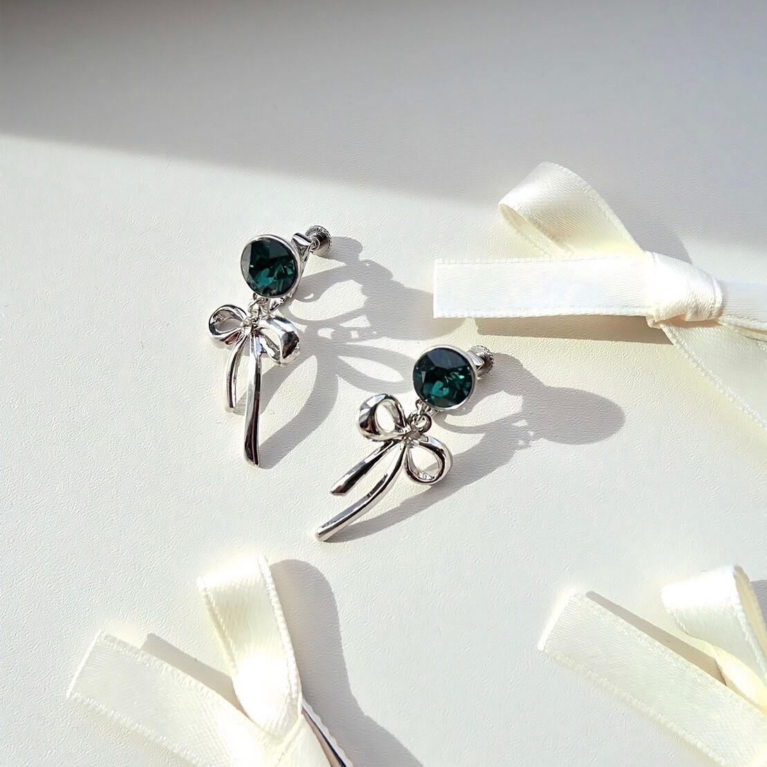Classical Crystal Ribbon Earrings <Silver / Emerald Pachira>