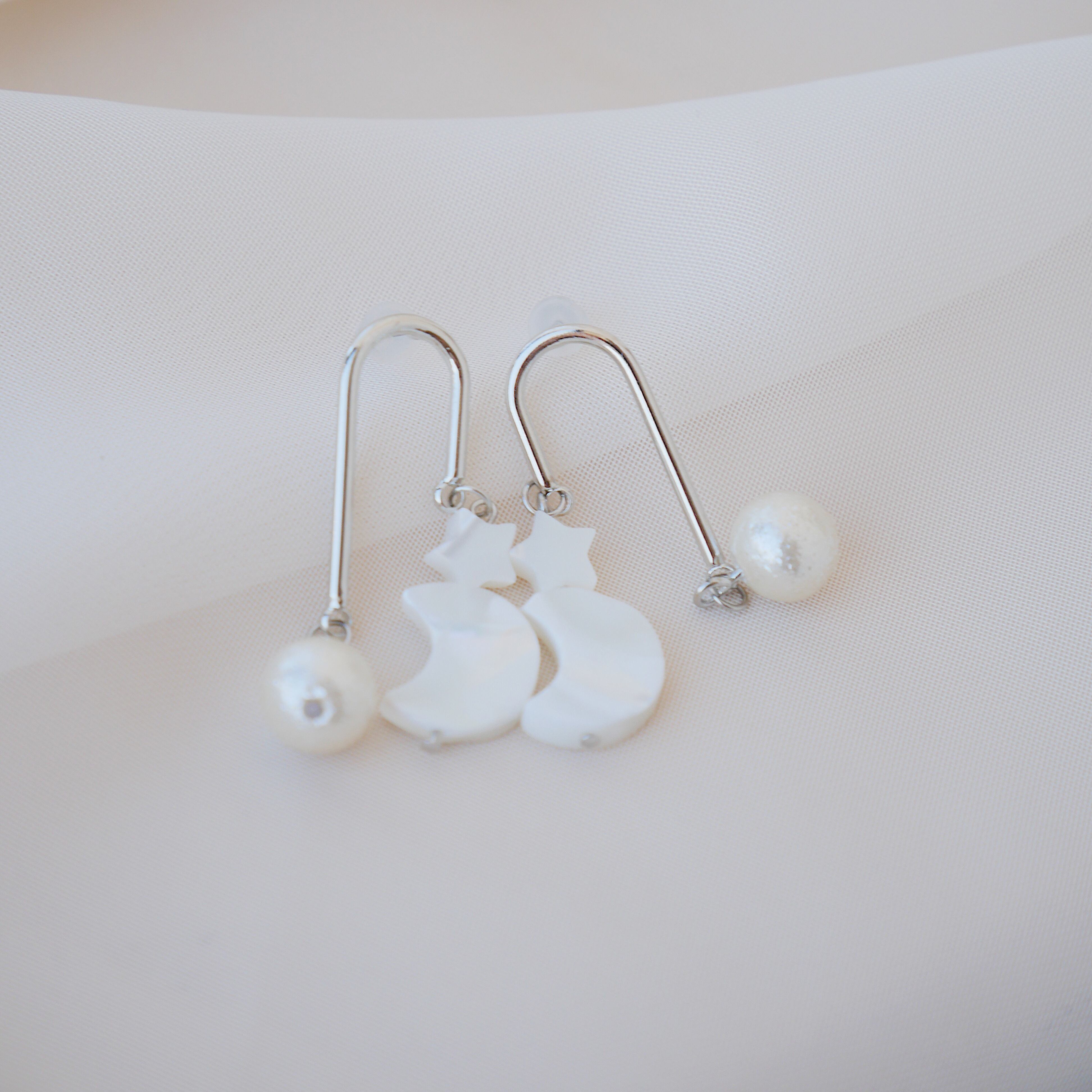 スワロフスキーパールと、天然石の上品な輝きが動くたびに揺れて視線を集めます。