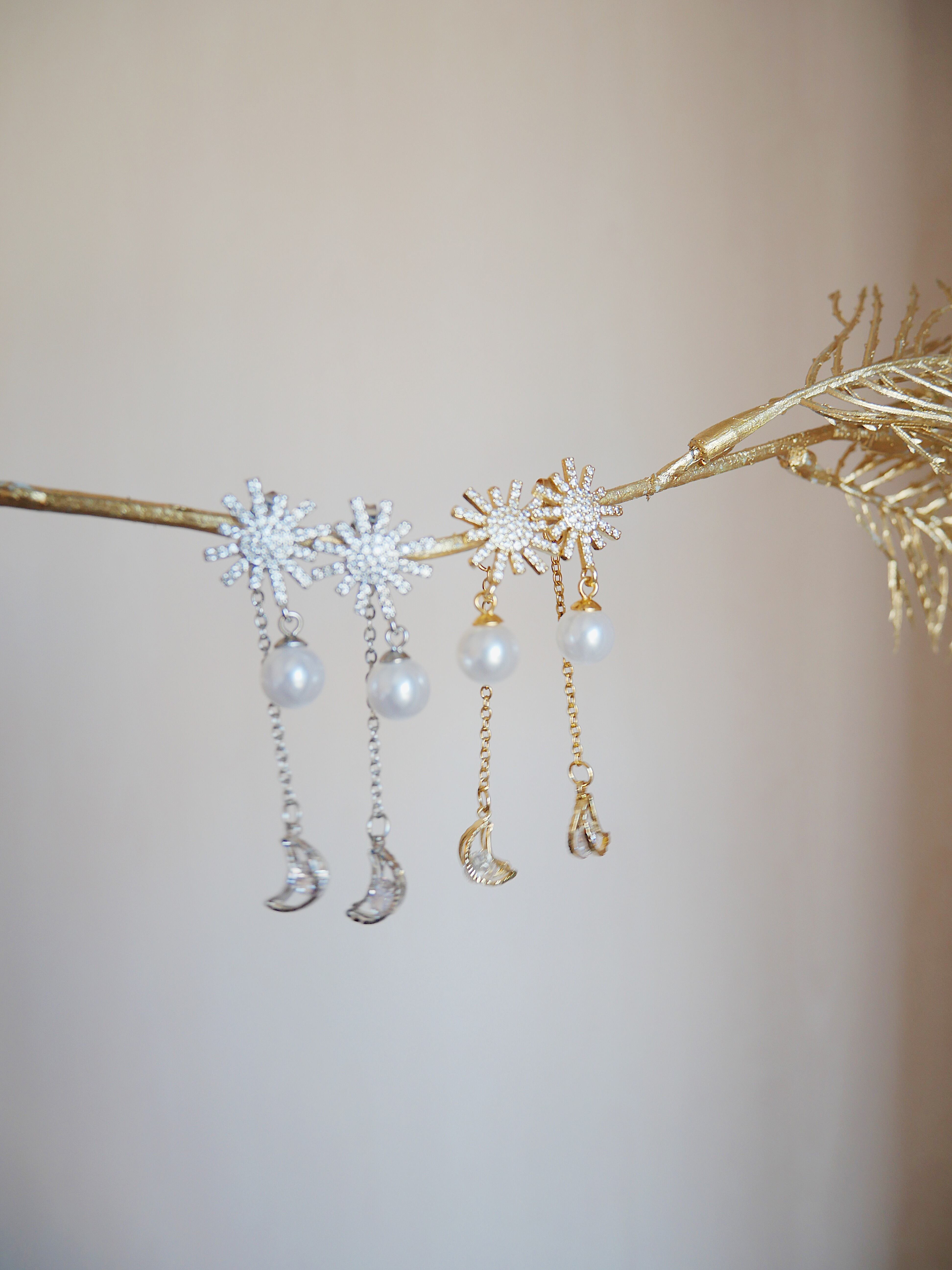 キュービックジルコニアの星と月のチャームが揺れる、今回のコレクションの代表的なデザインのイヤリング/ピアスシリーズ。