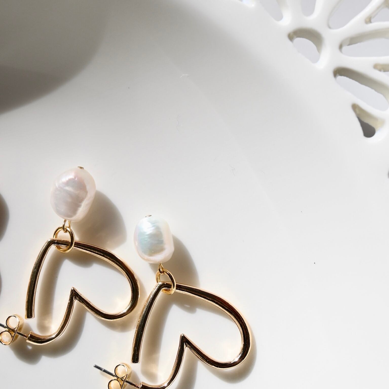 ハート型のフープピアスに、淡水パールが揺れる、ピアスシリーズです。