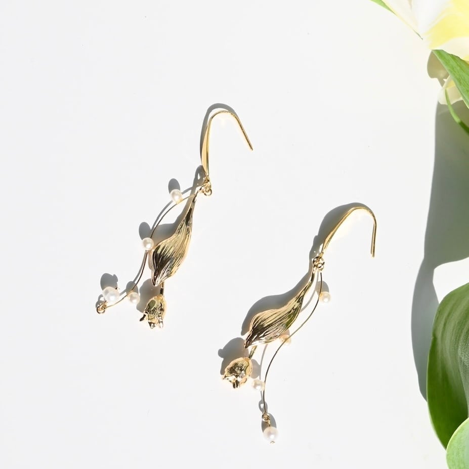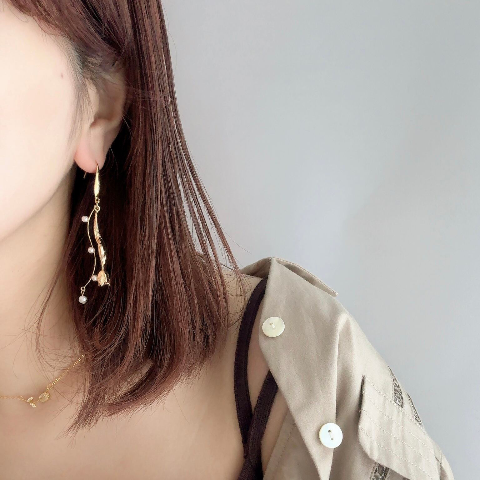 曲線的なパールと繊細なチューリップが交わるエレガントなデザインが特徴のピアス、イヤリングシリーズです。