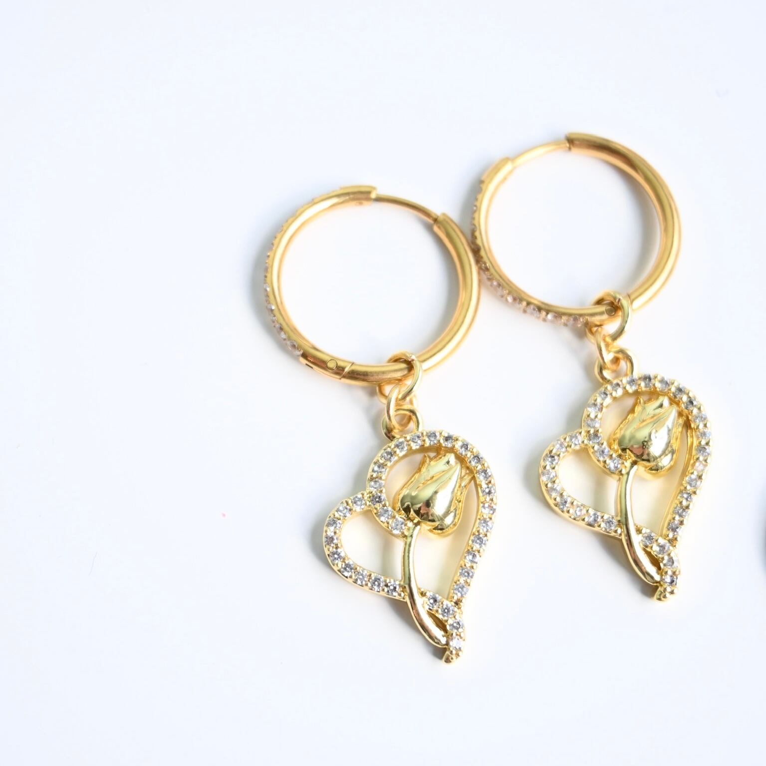 ハートとチューリップのモチーフが特徴的なフープピアスです。