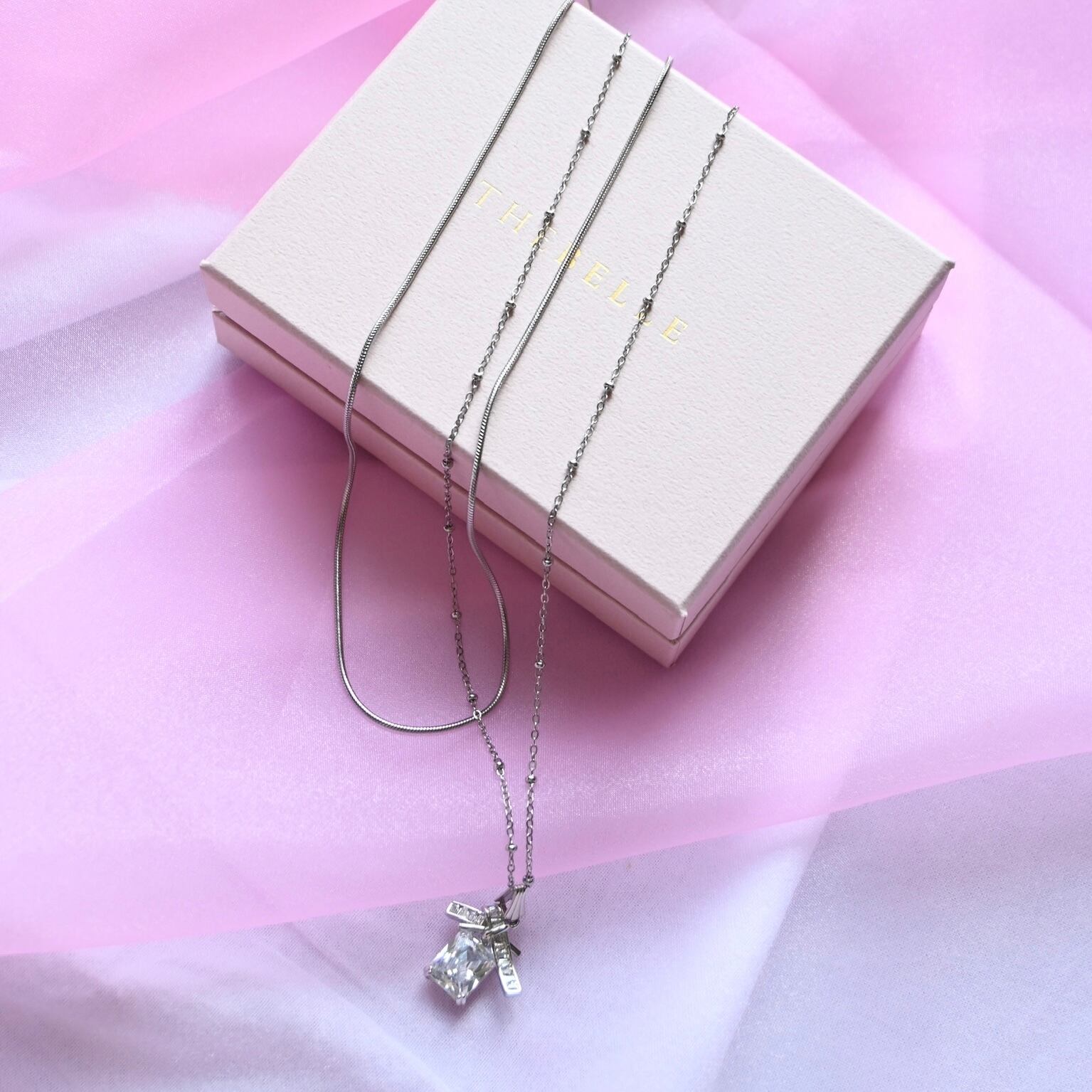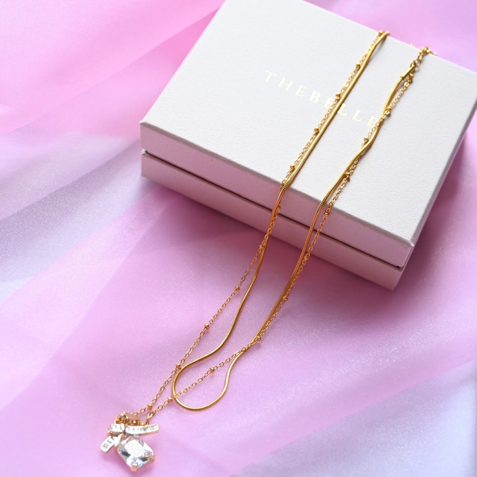 華やかなクリスタルのチャームがついたエレガントなネックレスです。