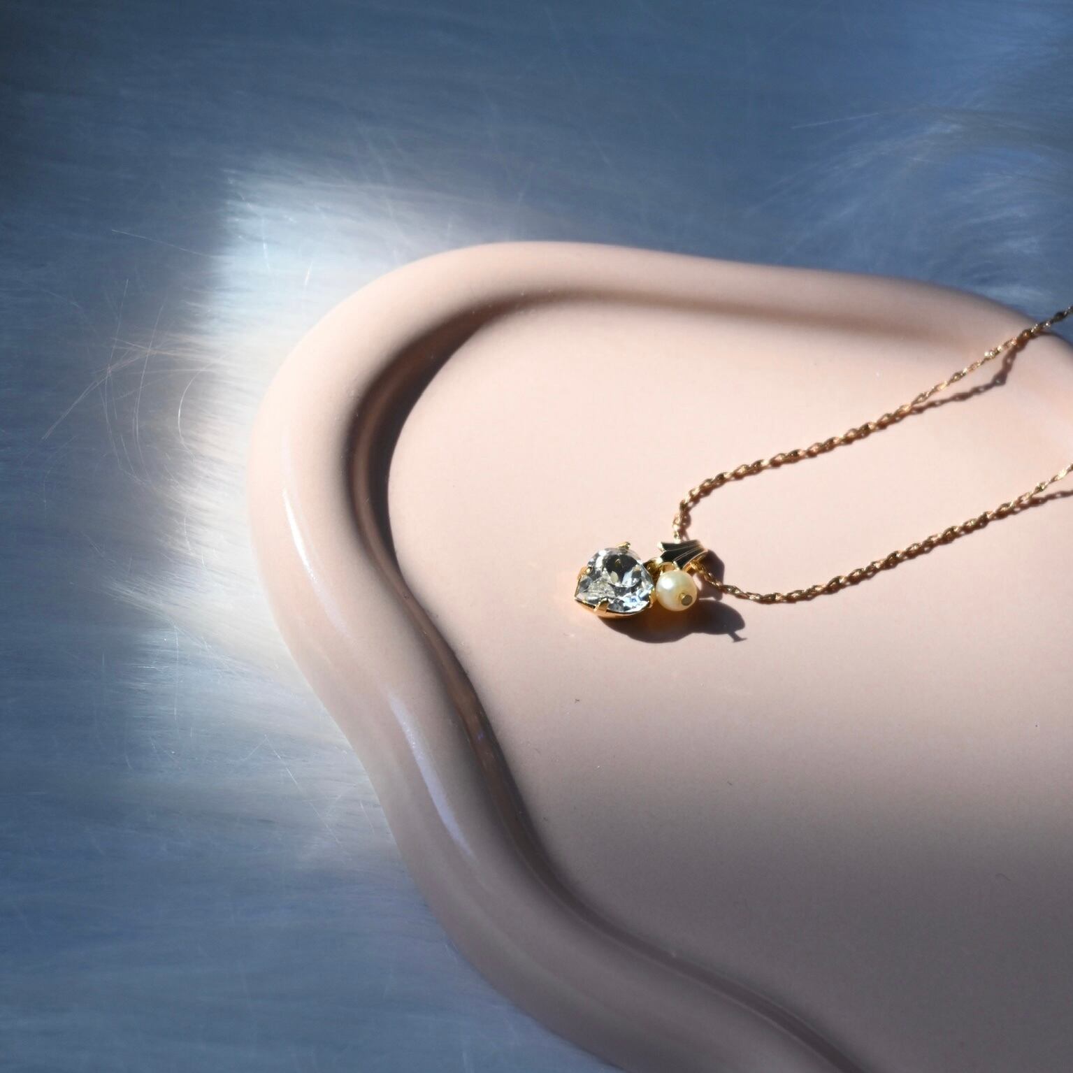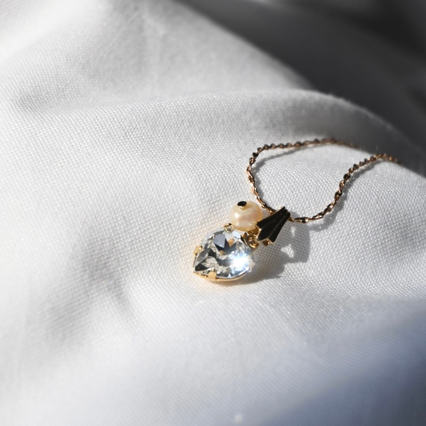 繊細で華奢なチェーンに存在感のあるクリスタルチャーム・淡水パールがポイントです。