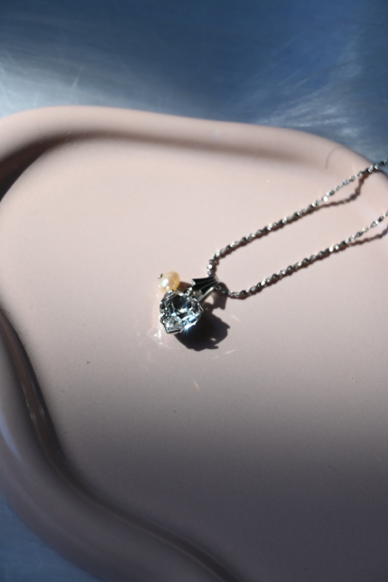 繊細で華奢なチェーンに存在感のあるクリスタルチャーム・淡水パールがポイントです。
