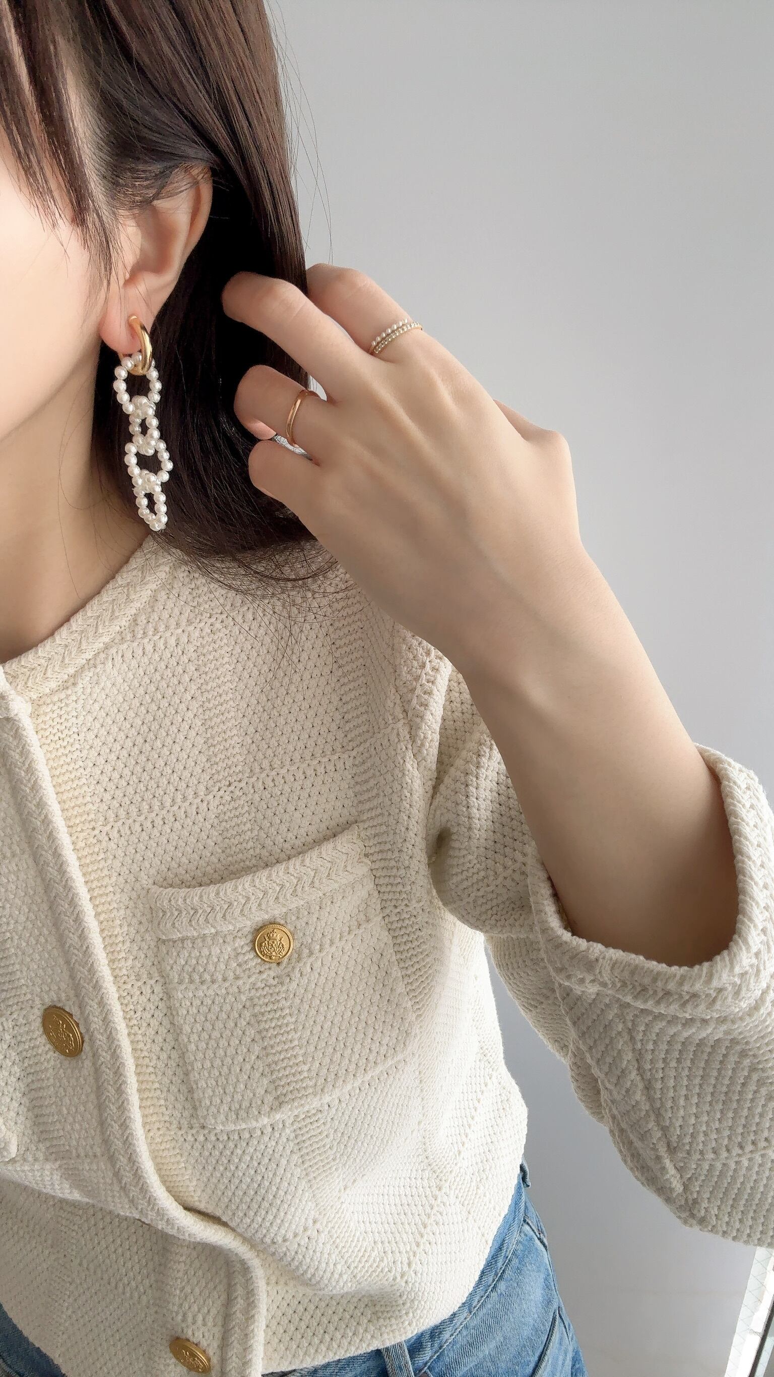 クールなチェーンをパールにすることで、フェミニンなチェーンモチーフが完成しました。