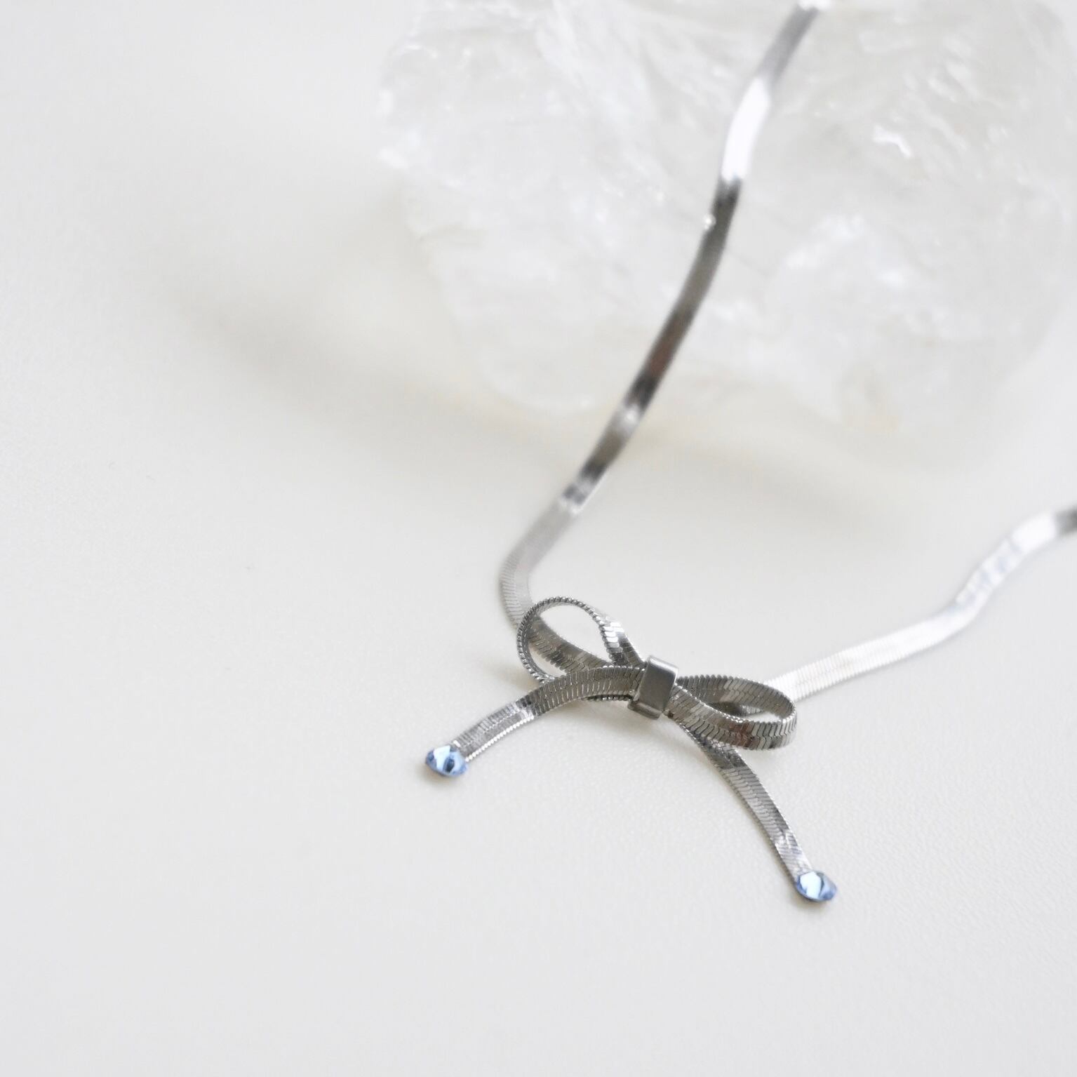 リボンの先端部分には、さりげなくストーンを配し、遊び心のあるアイテムとなりました。