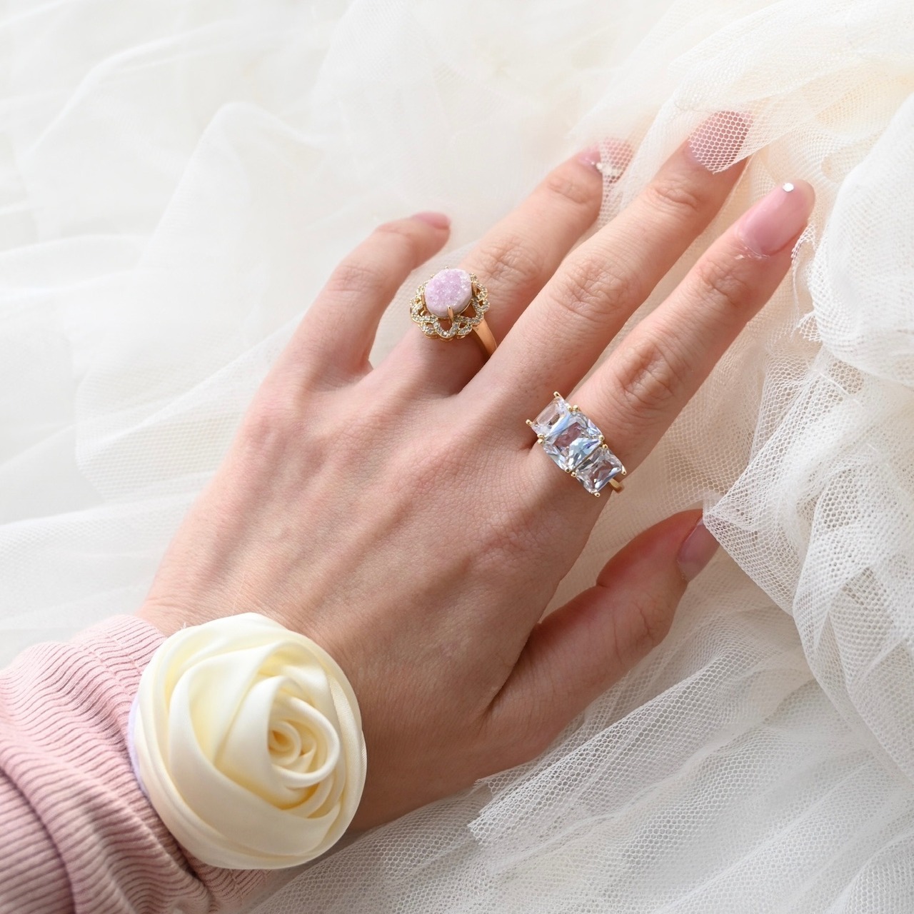 クリスタルの輝きがとても美しく、細めのリングとの重ねづけもおすすめです。