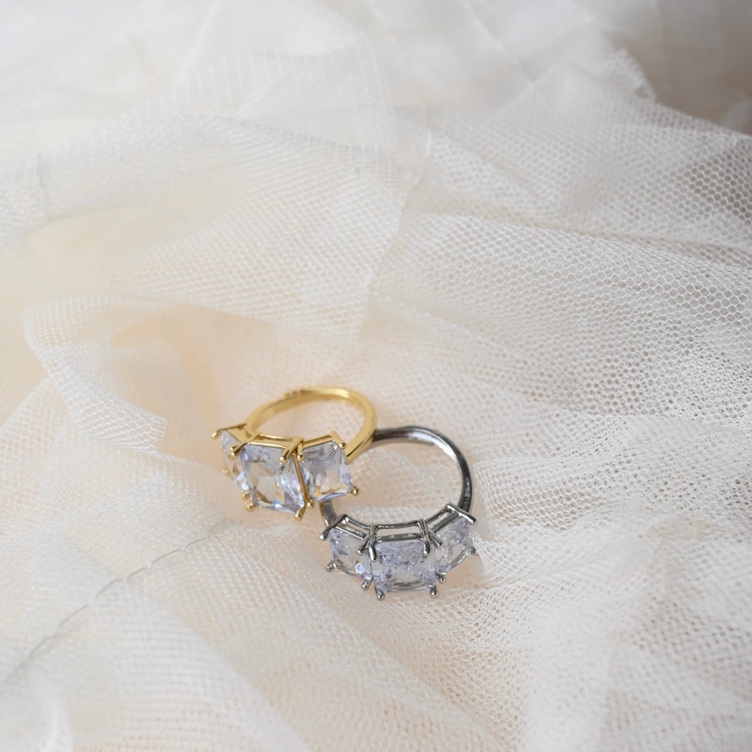 大ぶりで存在感のある三連クリスタルのリングシリーズ。