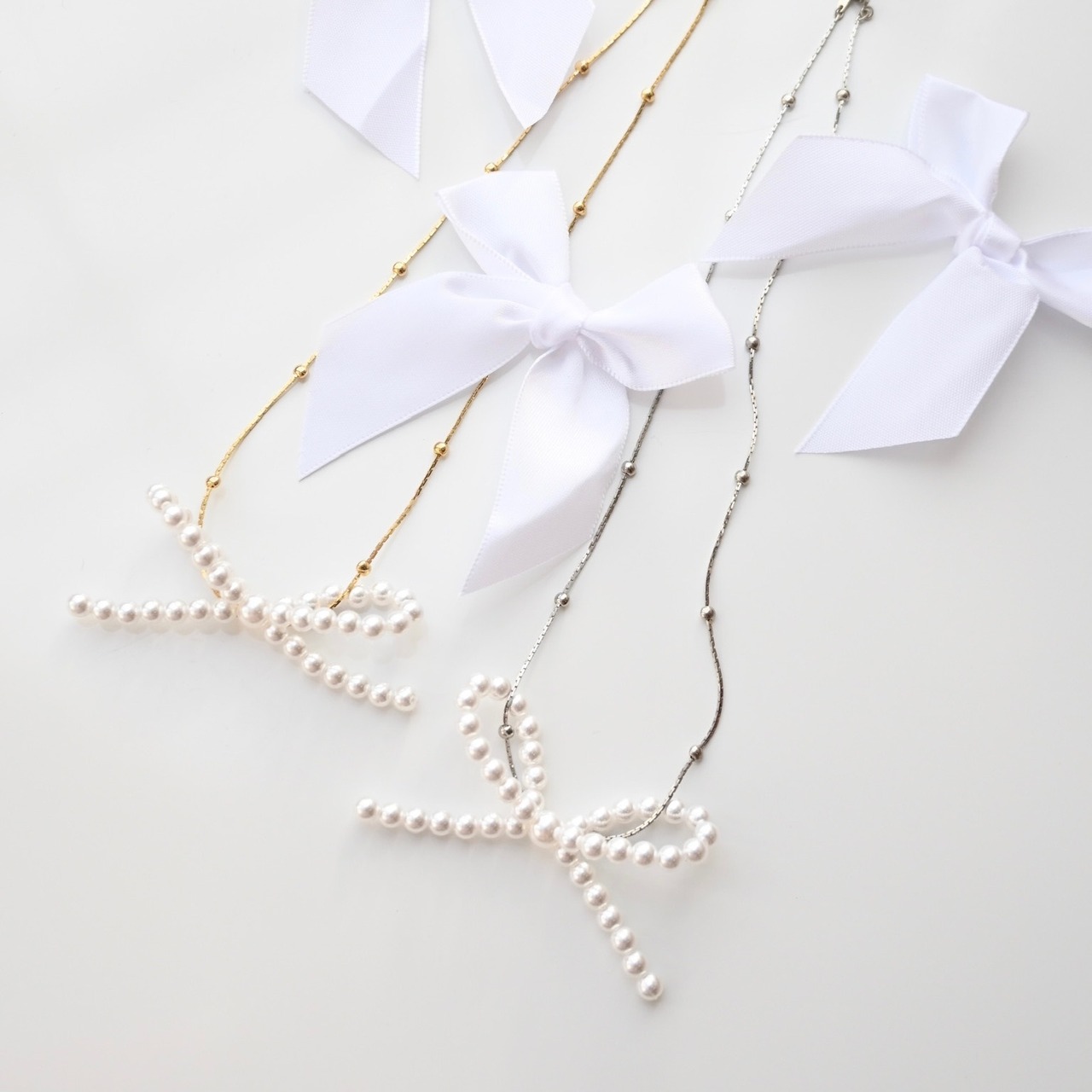 華やかなリボンパールとデザインチェーンが可愛らしいネックレスシリーズ。