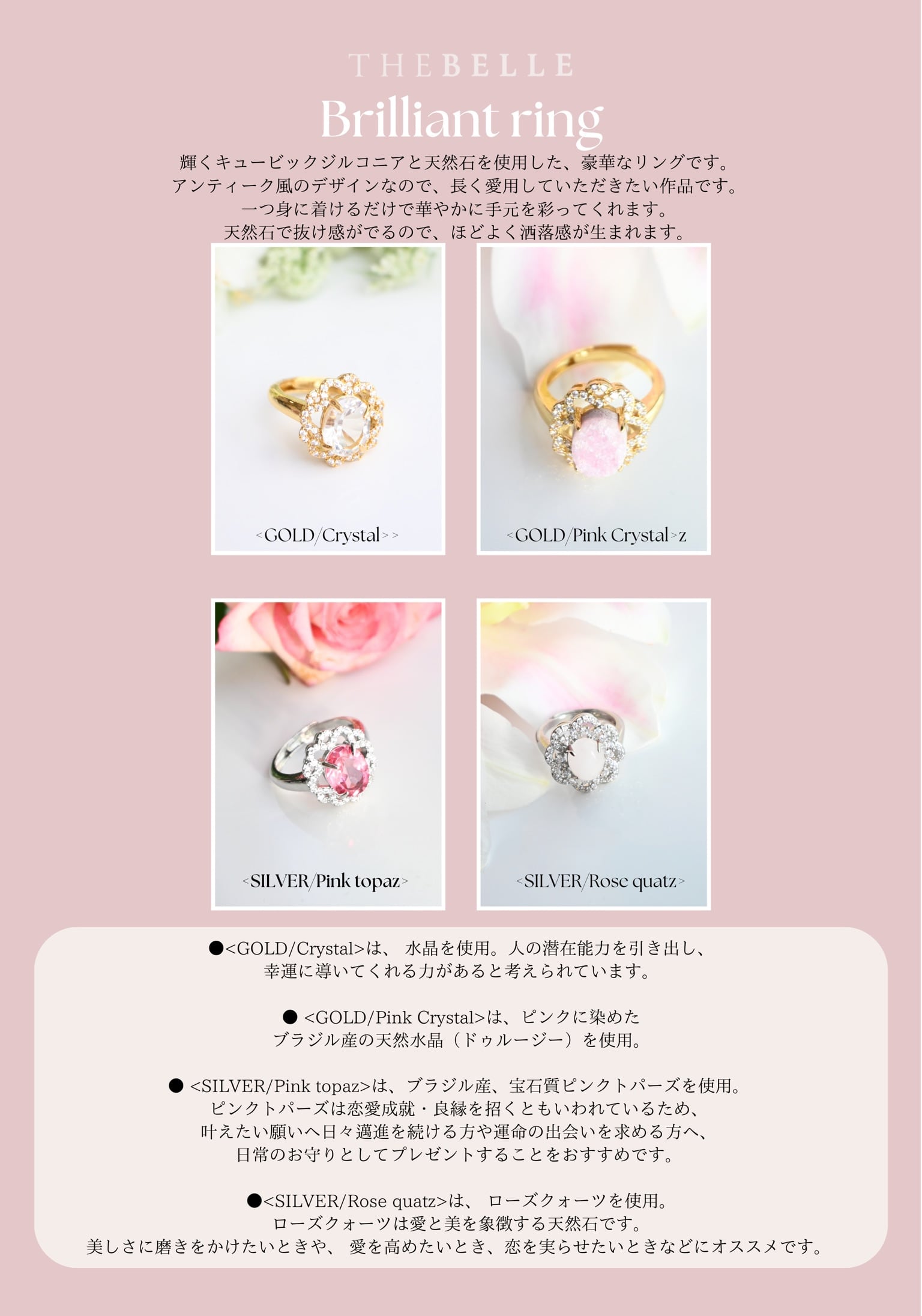 <GOLD/Pink Crystal>は、ピンクに染めたブラジル産の天然水晶(ドゥルージー)を使用。人の潜在能力を引き出し、幸運に導いてくれる力があると考えられています。 そのため精神の安定や直感力アップ、ヒーリングなど、さまざまな効果があるとされています。