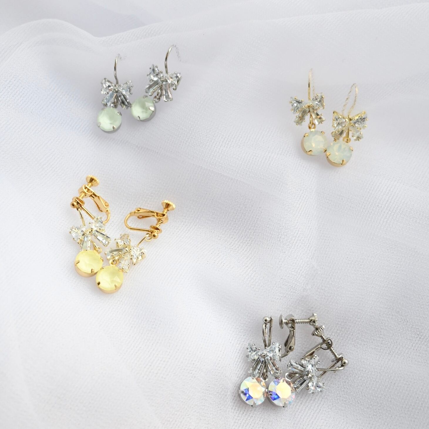 キラキラ輝く華奢なキュービックジルコニアのリボンに、ラウンドクリスタルが光る、デイリーに使いたくなるイヤリングピアスシリーズです。