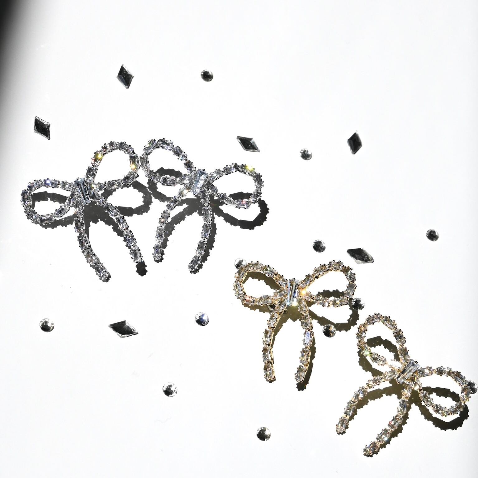 キラキラしたストーンが華やかなリボンモチーフのピアス・イヤリングシリーズです。